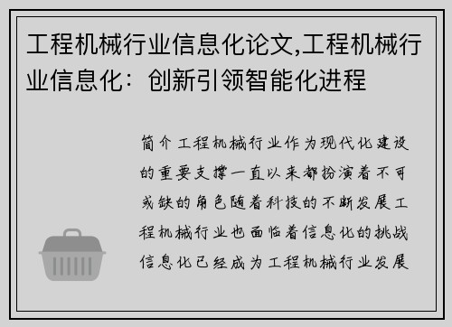 工程机械行业信息化论文,工程机械行业信息化:创新引领智能化进程