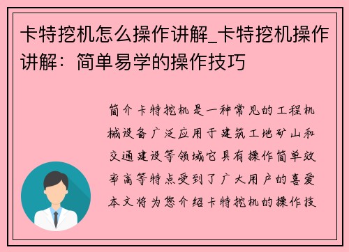 卡特挖机怎么操作讲解_卡特挖机操作讲解:简单易学的操作技巧
